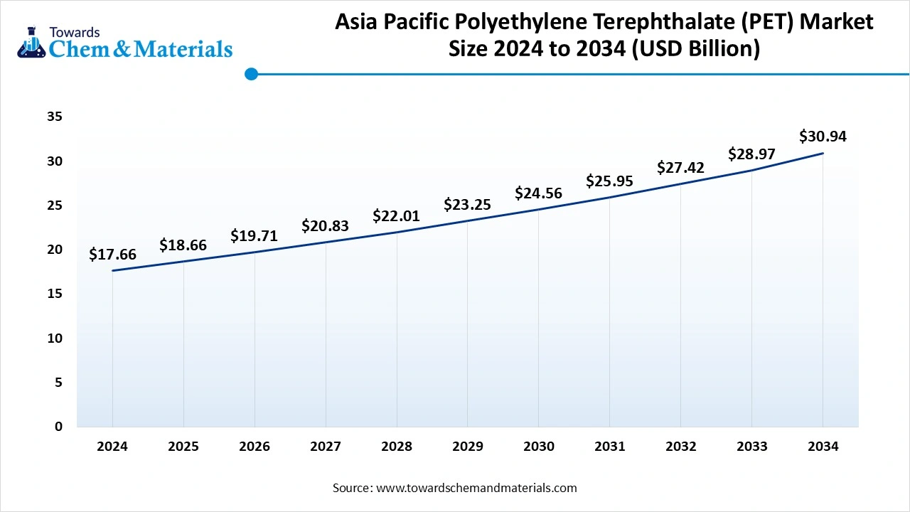 - The Asia Pacific polyethylene terephthalate (PET) market size was estimated at USD 17.66 billion in 2024 and is expected to reach USD 30.94 billion by 2034, growing at a CAGR of 5.77% from 2025 to 2034.